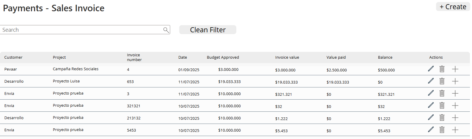 - Payments: managing invoices issued to clients for different projects. Results: the core of the application, where indicators and balances reveal whether a project is truly profitable.
