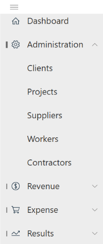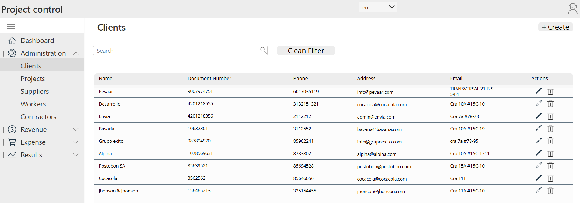 - Administration: registering clients, employees, projects, contractors, and suppliers.
