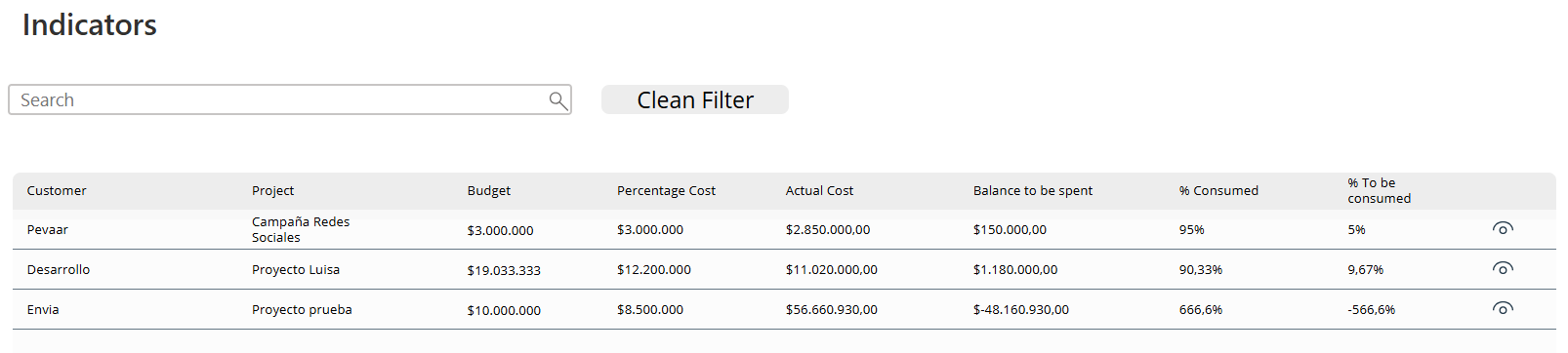 The screen is created in the same way as in point 2.2.1 but the columns will be filters by project, with the following columns: