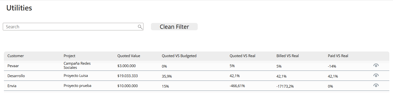 On the other costs screen, we have a table with information on the billed amount, actual profit, withholding tax, reteICA, other withholdings, and other costs. This is filtered by project.