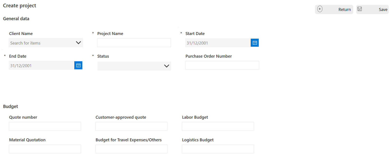 - The Create Project screen uses a form connected to the Projects table in Dataverse, with a Save Button to submit the record and a Back Button to return.