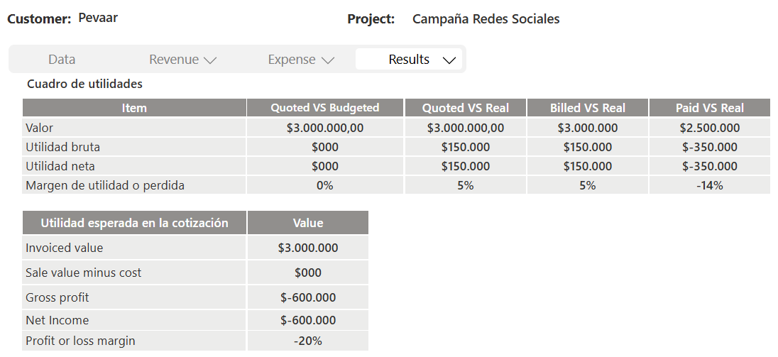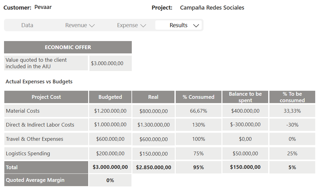 In the results, we found 2 screens; the first displays the project indicators, a screen with labels that show information extracted directly from the tables in Dataverse and filtered by the selected project.