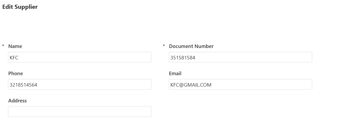 Almost identical to the Create Supplier screen, but smarter. Instead of starting blank, the form opens with the supplier’s details already filled in, so you just tweak what’s necessary and save.