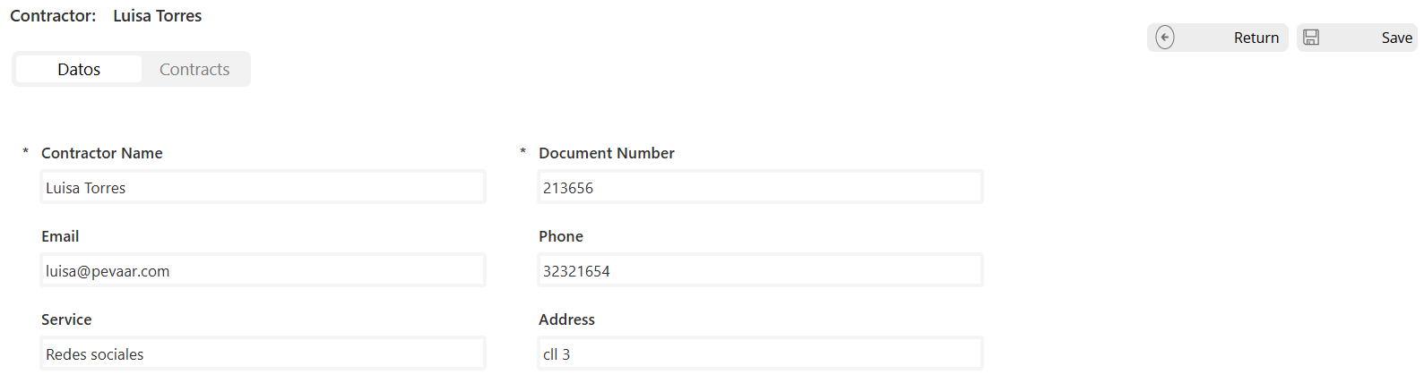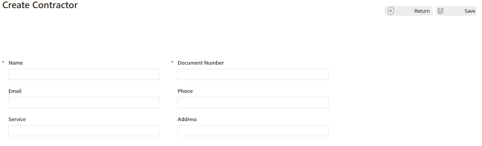 Works the same way as other “create” screens: a Back Button, a Save Button, and a Dataverse-powered form that makes adding a new contractor fast and intuitive.
