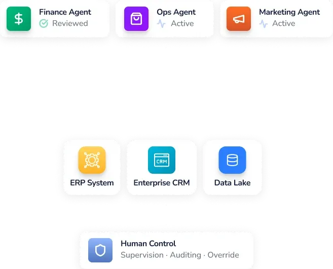 Deploy orchestration in a single business domain. Validate decision routing, policy enforcement, and human oversight workflows with real operations.