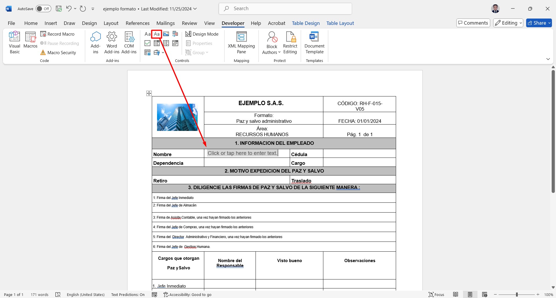 Una vez hecho lo anterior podemos añadir el texto dinámico con los comandos de desarrollador, debemos hacer clic en el campo donde vamos a añadir el texto, luego damos clic en plain text content control o control de contenido de texto sin formato (imagen 20)